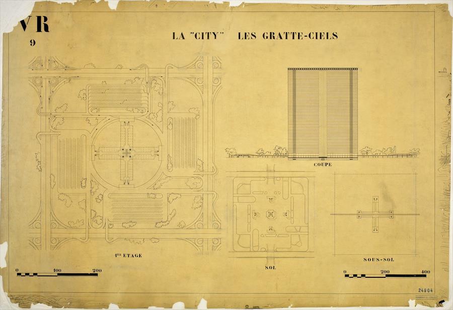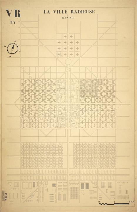 Trong tầm nhìn của Le Corbusier về các thành phố tương lai, một khu thương mại sẽ được đặt ở trung tâm, kết nối các khu dân cư và thương mại riêng biệt bằng hệ thống giao thông ngầm. Các tòa nhà lắp ghép sẽ đóng vai trò như những ngôi làng thẳng đứng với các tiệm giặt ủi riêng, cũng như nhà trẻ và sân chơi trên tầng thượng. Các căn hộ tiêu chuẩn sẽ được sử dụng chung không gian công cộng. Cư dân sẽ được tận hưởng sự yên bình, tách biệt khỏi các khu công nghiệp.