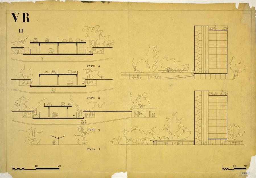 Khi Le Corbusier lần đầu công bố quy hoạch đô thị chưa hoàn thành Ville Radieuse (Thành phố Rạng rỡ) vào năm 1933, ông đã hình dung ra một thành phố tương lai với những tòa nhà chọc trời mật độ cao được đúc sẵn, trải rộng trên một không gian xanh rộng lớn và được sắp xếp theo lưới Descartes, cho phép thành phố hoạt động như một “cỗ máy sống”. Le Corbusier đề xuất ý tưởng về những khu vườn trên mái rộng lớn để phục hồi không gian xanh ngập nắng bị mất đi bên dưới các tòa nhà chọc trời. Ngoài ra, Le Corbusier còn đề xuất xây dựng đường cao tốc trên cao và bãi đỗ xe tự động cao 5 mét so với mặt đất để dành toàn bộ mặt đất cho người đi bộ.