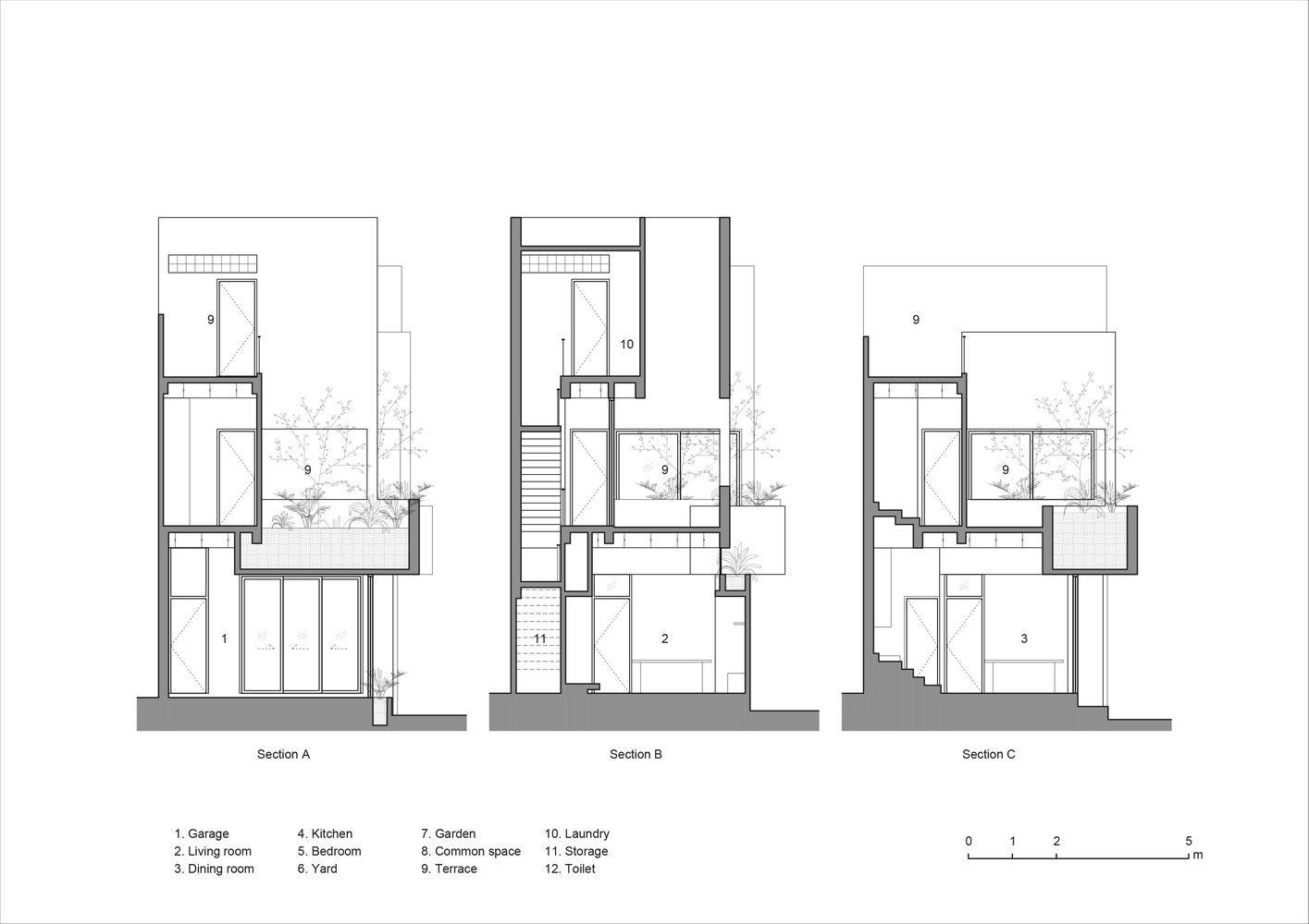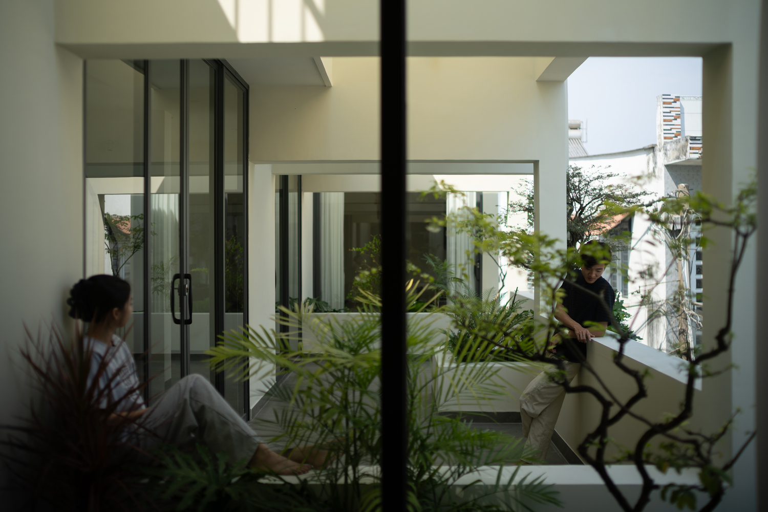 Trình tự không gian được mở ra thông qua nhịp điệu xen kẽ giữa các khu vực sinh hoạt chung và riêng tư. Khi bước vào, người ta sẽ bắt gặp khu vực sinh hoạt chung bao gồm phòng khách và nhà bếp; phía sau đó là các không gian ngủ riêng tư hơn. Đi lên theo chiều dọc, cầu thang dẫn đến một sân trong rộng lớn ở trung tâm - một không gian sinh hoạt chung được mở rộng, đóng vai trò là "trái tim" của ngôi nhà - trong khi các phòng ngủ riêng tư nằm ở hai đầu. Cách bố trí các không gian chung - riêng - chung - riêng này tạo ra một trải nghiệm không gian nhiều lớp, trong đó mức độ tương tác được điều chỉnh một cách linh hoạt. Cấu hình như vậy củng cố mối liên kết gia đình đồng thời bảo tồn những khoảnh khắc riêng tư. Trong bối cảnh đô thị hiện đại, nơi lối sống có xu hướng ngày càng khép kín, việc tạo ra các không gian trung gian khuyến khích sự tương tác và hòa mình với ánh sáng và gió trời trở nên cần thiết hơn bao giờ hết.