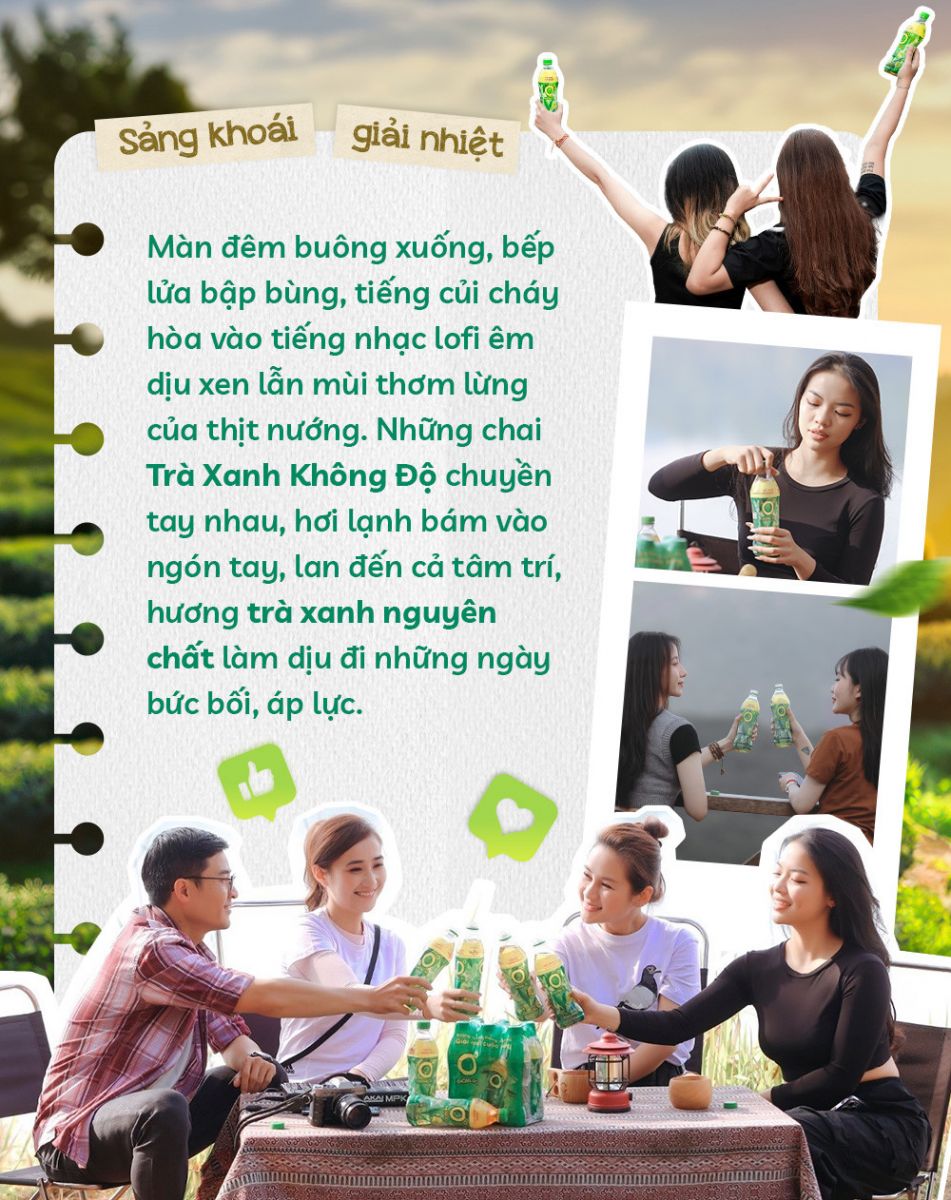 Màn đêm buông xuống, bếp lửa bập bùng, tiếng củi cháy hòa vào tiếng nhạc lofi êm dịu xen lẫn mùi thơm lừng của thịt nướng. Những chai Trà Xanh Không Độ chuyền tay nhau, hơi lạnh bám vào ngón tay, lan đến cả tâm trí, hương trà xanh nguyên chất làm dịu đi những ngày bức bối, áp lực.