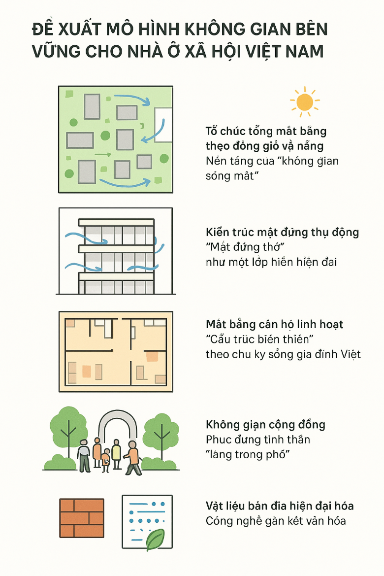 Tổng kết lại, mô hình 5 lớp thiết kế - từ tổng mặt bằng, mặt đứng thụ động, căn hộ linh hoạt, không gian cộng đồng đến vật liệu bản địa hiện đại hóa - tạo nên một cấu trúc NOXH bền vững, giàu bản sắc và thích ứng khí hậu. Đây không chỉ là mô hình kỹ thuật mà còn là mô hình văn hóa - xã hội, cho phép cư dân sống trong một môi trường hiện đại mà vẫn giữ được mạch nối với truyền thống và tinh thần bản địa Việt Nam.