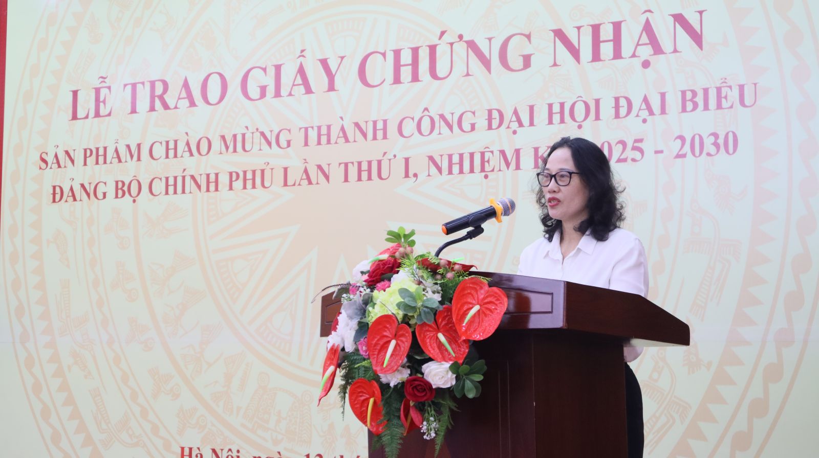 Tại buổi Lễ, đồng chí Hà Thị Trang, Phó Trưởng Ban Thường trực Ban Tuyên giáo và Dân vận Đảng ủy Chính phủ đã công bố Quyết định của Ban Thường vụ Đảng ủy Chính phủ chứng nhận sản phẩm chào mừng Đại hội đại biểu Đảng bộ Chính phủ lần thứ I, nhiệm kỳ 2025-2030. Đồng thời, lãnh đạo Đảng ủy Chính phủ trao Giấy chứng nhận cho Đảng bộ Viện Kiến trúc Quốc gia.