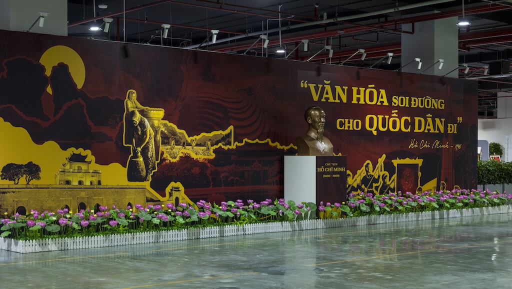Bước vào khu triển lãm quy mô tới 900.000 m2 mang biểu tượng Thần Kim Quy sừng sững, người xem có cảm giác như đang ngược dòng thời gian, hoài niệm những năm tháng thiêng liêng và hào hùng của dân tộc. Lá cờ đỏ sao vàng, cờ đỏ búa liềm được treo trang trọng từng hàng ở trung tâm, ánh sáng dịu hắt xuống gợi lên những xúc cảm tự hào sâu sắc.