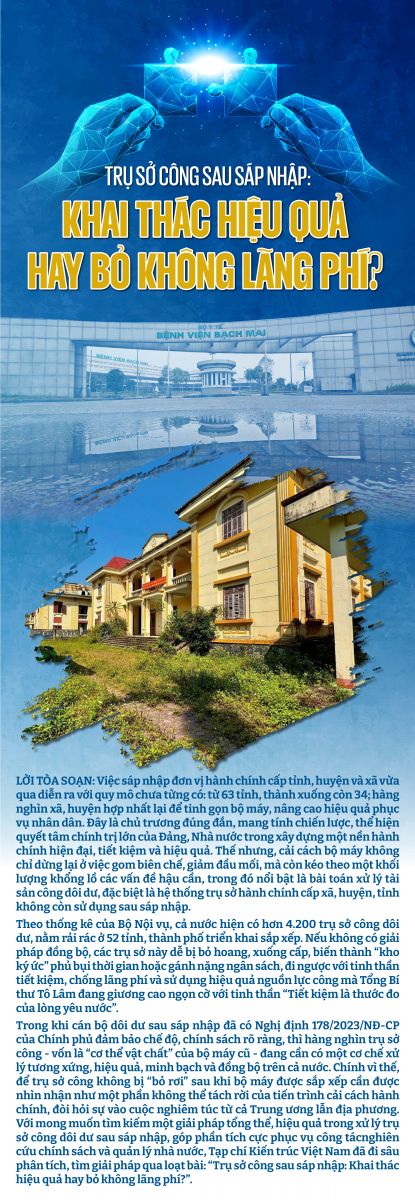 Chia sẻ về việc quản lý và duy trì các trụ sở công, lãnh đạo một địa phương (xin được giấu tên) chia sẻ riêng với phóng viên: “Hiện tại, tại các trụ sở cũ, chúng tôi vẫn bố trí một nhóm cán bộ làm việc dạng thường trú tại đây, không để đầy đủ các ban bệ như trước nhằm đáp ứng các dịch vụ cho người dân gần khu vực hành chính cũ. Về lâu dài, khi công tác sắp xếp công việc đạt yêu cầu, chúng tôi sẽ chuyển đổi công năng các công trình để tập trung hết nguồn lực về trung tâm tỉnh. Đối với các trụ sở không thể sử dụng cho các mục đích cộng đồng, tỉnh sẽ thực hiện các biện pháp quản lý tài sản như thu hồi và giao cho các cơ quan chức năng quản lý hoặc thanh lý, đấu giá theo đúng quy định của pháp luật”.