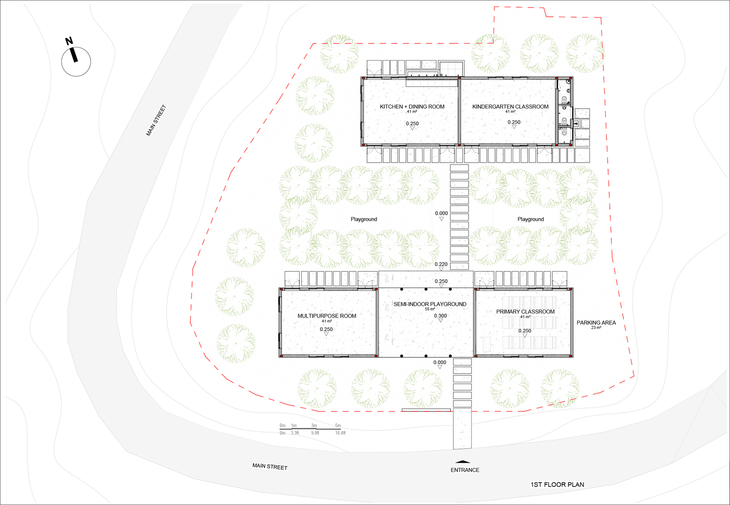 Với mục tiêu bảo tồn cảnh quan xanh hiện có và hòa hợp với thiên nhiên, các lớp học và tòa nhà được bố trí sao cho cửa sổ hướng ra những ngọn núi rừng bao quanh. Sân trong trung tâm được thiết kế để thu trọn tầm nhìn toàn cảnh thung lũng.