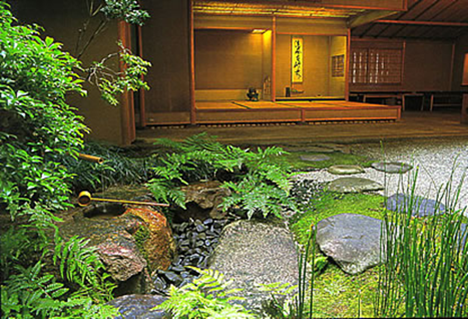 Đá bước (tobi-ishi), bể rửa tay (tsukubai), cây bụi thấp, cổng nhỏ |