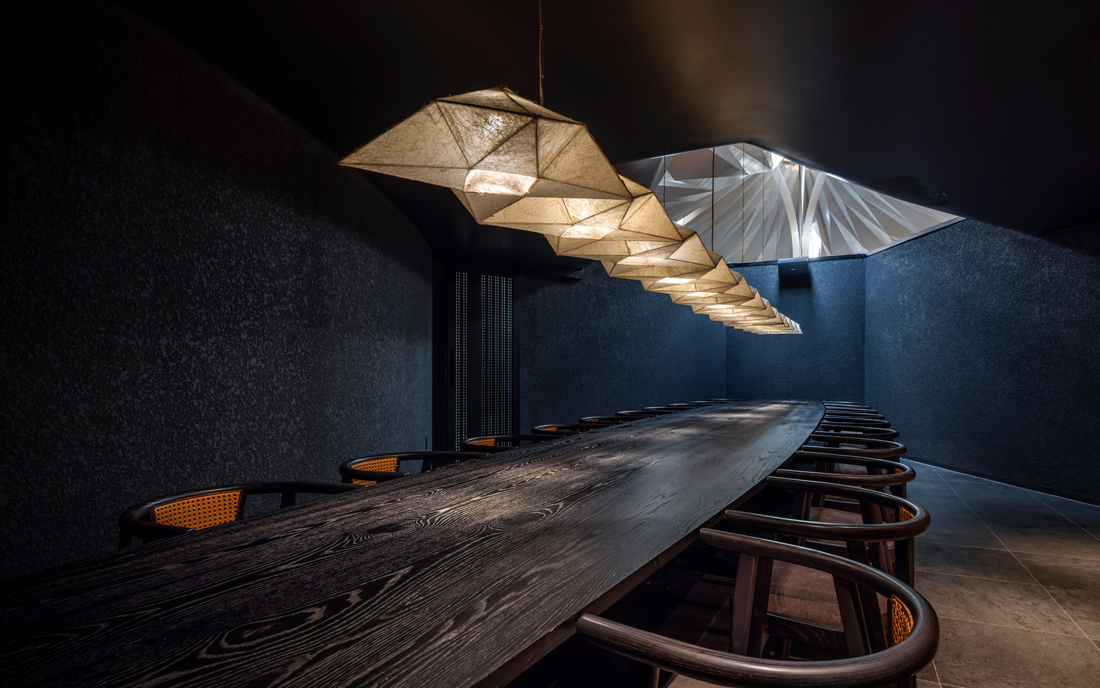 Hình học gấp khúc tạo nên sự hiện diện trực quan trên cả ba góc nhìn, đồng thời xác định các không gian chuyển tiếp dành cho tụ họp và biểu diễn. Những đường cong lấp lánh dẫn dắt sự lưu thông tự nhiên bên trong nhà hàng, tạo ra một không gian nội thất nơi chuyển động trở thành một phần của trải nghiệm ăn uống – chiều cao trần nhà khác nhau và sự thu hẹp không gian khuyến khích sự khám phá khi thực khách di chuyển trong không gian.