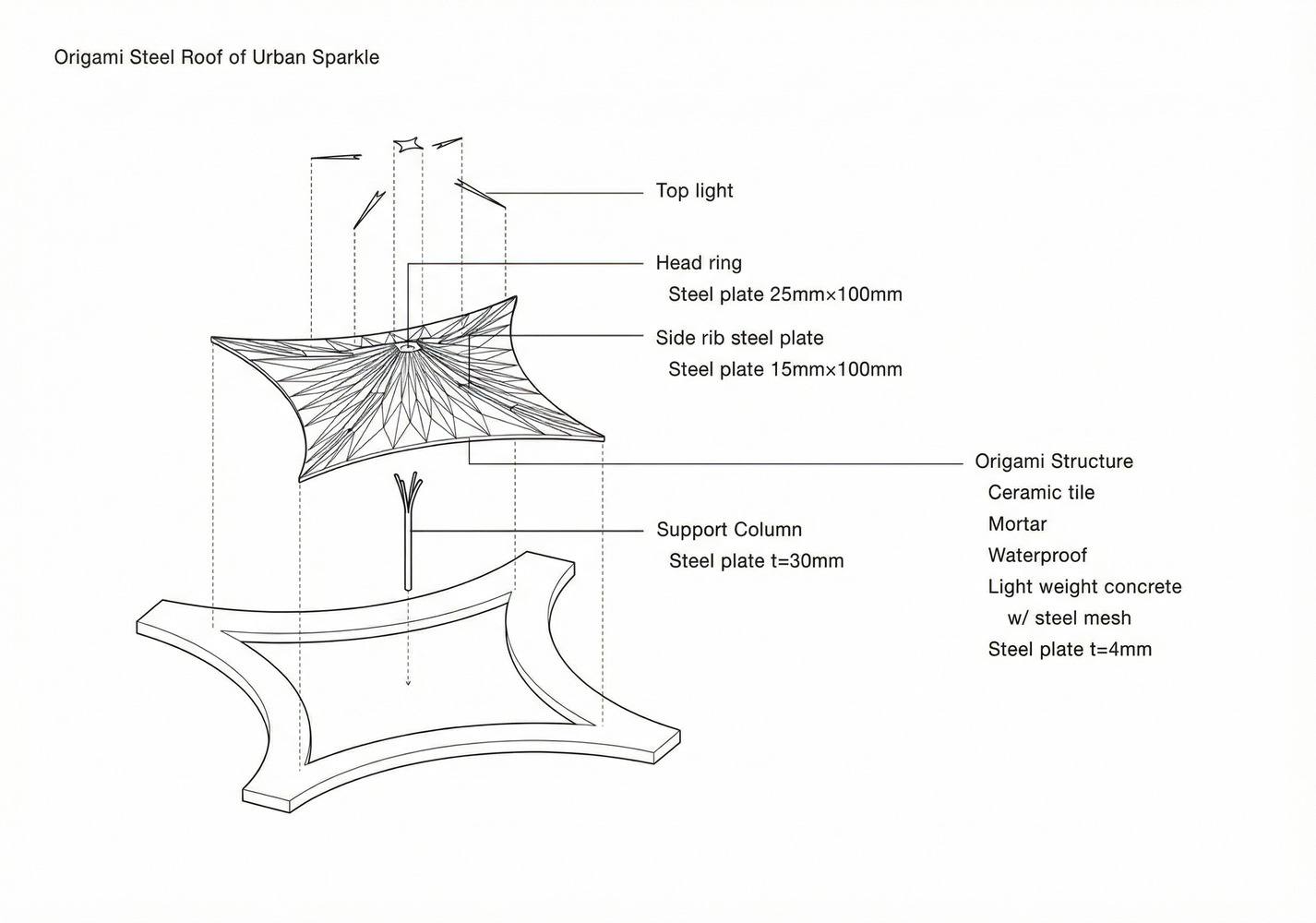 Cấu trúc mái sử dụng các tấm thép dày 4mm với nhịp tối đa 6m, thể hiện cách hình học origami biến vật liệu mỏng thành một hệ thống kết cấu hiệu quả thông qua việc gấp – có lẽ là ứng dụng đầu tiên của kết cấu thép tấm mỏng lấy cảm hứng từ origami tại Việt Nam. Độ dày tối thiểu này giúp duy trì trọng lượng nhẹ trong khi kiểu gấp cung cấp độ cứng cần thiết, cho phép ánh sáng tự nhiên xuyên qua các ô cửa sổ mái. Bề mặt thép phản chiếu ánh sáng một cách tinh tế, tăng cường hiệu ứng lấp lánh vào ban ngày và tỏa sáng ấm áp vào ban đêm. Khả năng gia công kim loại tại địa phương đã giúp hiện thực hóa hình học phức tạp này trong phạm vi ngân sách.