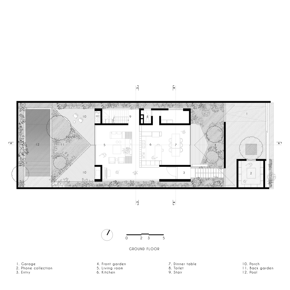 Cấu trúc không gian thể hiện, bảo tồn và tận dụng sự cởi mở và chuyển tiếp liền mạch đặc trưng của văn hóa Việt Nam. Việc tích hợp vườn vào trong nhà trở nên khó khăn hơn nhiều với thiết kế này. Bên cạnh việc cung cấp các khu vực chuyển tiếp và những vùng bóng mát dễ chịu cho không gian bên trong, hệ thống mái trải dài và dốc xuống còn loại bỏ bầu không khí "nhà phố" của khối nhà. Ánh nắng mặt trời, gió, nước và cây cối có thể đến mọi ngóc ngách của dự án nhờ bố cục liền mạch từ trước ra sau của khu vườn hai mặt thoáng.