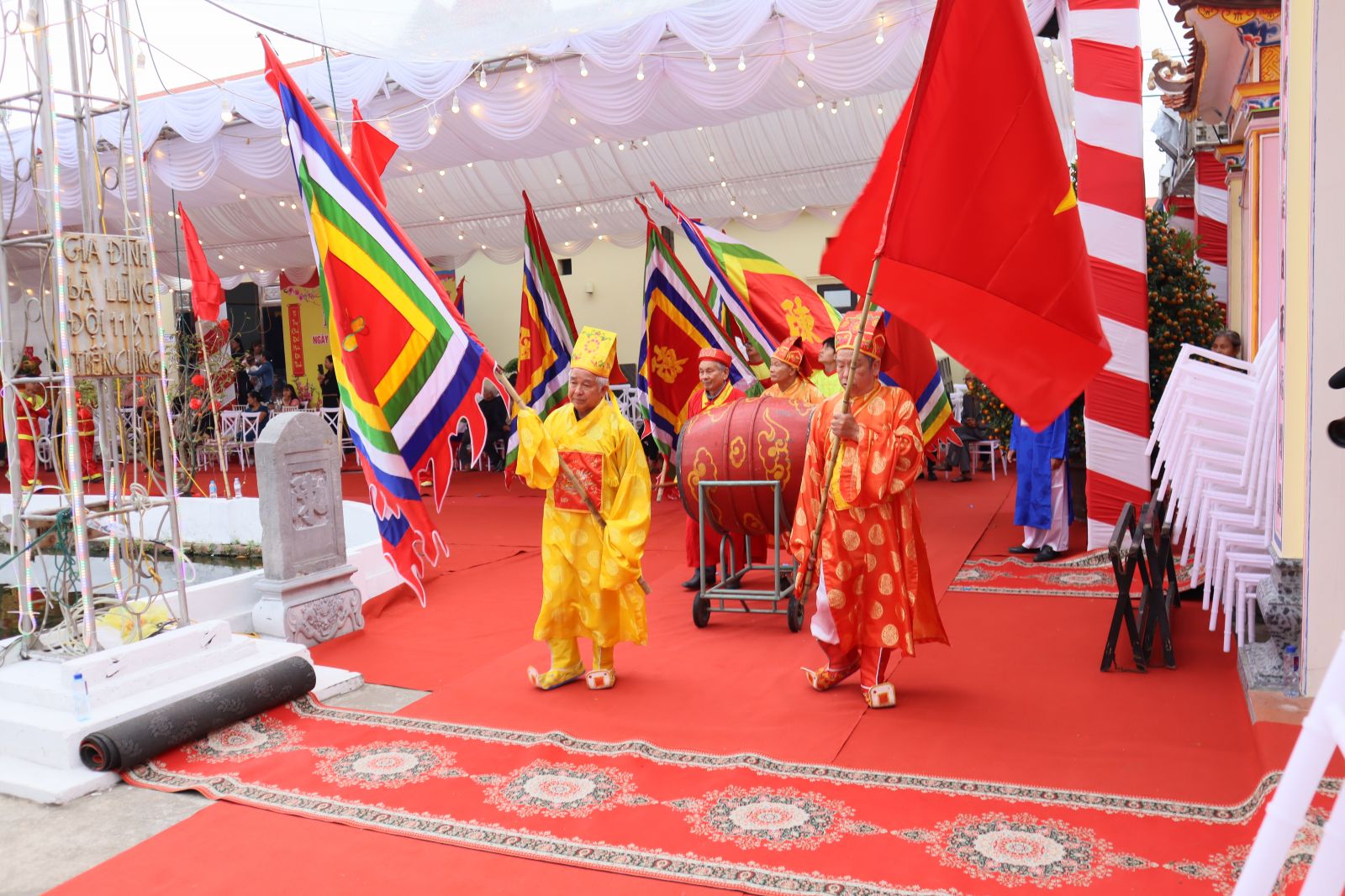 Nghi thức rước kiệu trang nghiêm quanh nhà Tổ trong Đại lễ Giỗ Đức Thủy Tổ họ Trần tại Trà Lũ – đoàn rước trong trang phục truyền thống, cờ lọng rực rỡ, thể hiện lòng thành kính và sự tiếp nối gia phong qua các thế hệ.