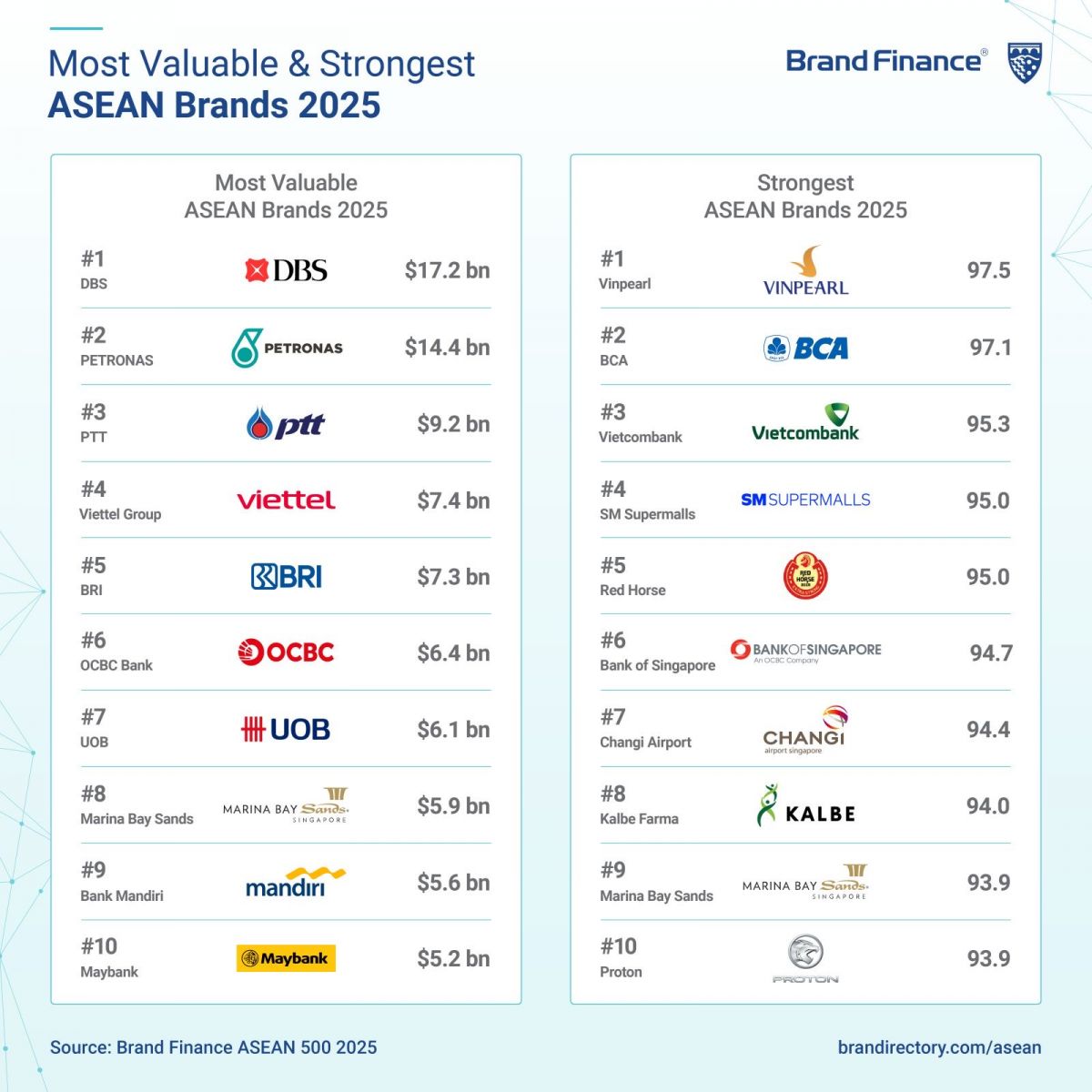 Theo Brand Finance, Vinpearl đã có cú bứt phá ngoạn mục, vượt qua những tên tuổi lớn như BCA (Indonesia) và Marina Bay Sands (Singapore), để trở thành thương hiệu mạnh nhất Đông Nam Á với điểm số sức mạnh thương hiệu (BSI) 97,5/100 và xếp hạng AAA+. “Nghiên cứu cho thấy Vinpearl đạt thành tích vượt trội nhờ khả năng được khách hàng chấp nhận ở phân khúc cao cấp, mức độ nhận biết thương hiệu mạnh mẽ và danh tiếng vững chắc tại Việt Nam,” Brand Finance nhận định.